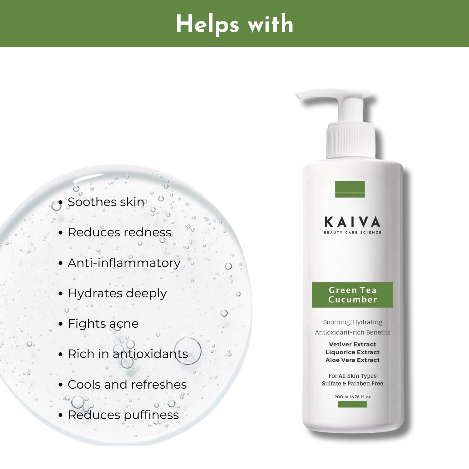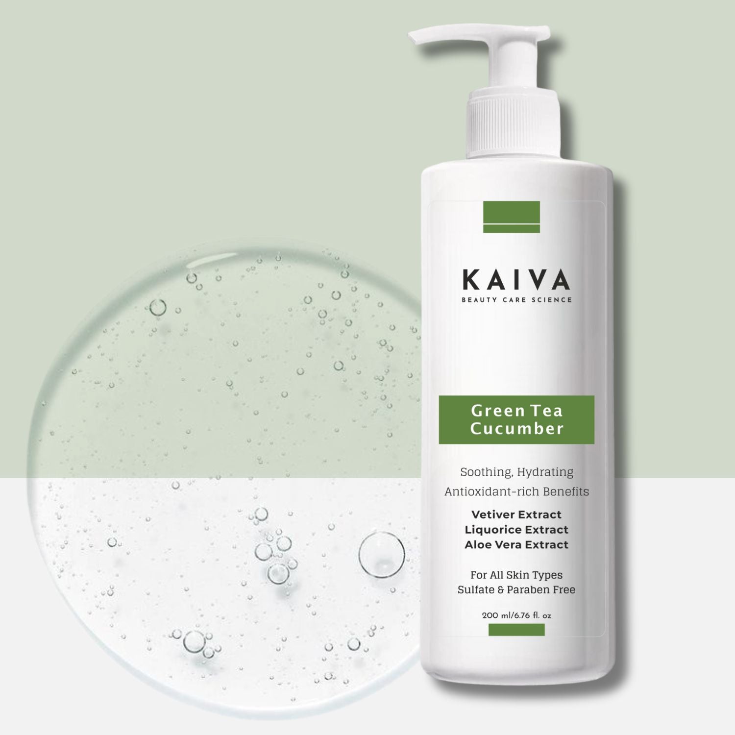 KAIVA's Green Tea & Cucumber Face Wash is a facial cleanser that contains Green Tea and Cucumber extracts, both of which are rich in antioxidants and have anti-inflammatory properties. This face wash can help to cleanse and purify the skin while providing hydration and nourishment. The Green Tea and Cucumber extracts in this face wash can help to soothe and calm irritated skin, reduce the appearance of puffiness and dark circles around the eyes, and provide a refreshing and revitalizing effect to the skin. Additionally, the natural fragrance of this face wash can provide a soothing and relaxing experience.