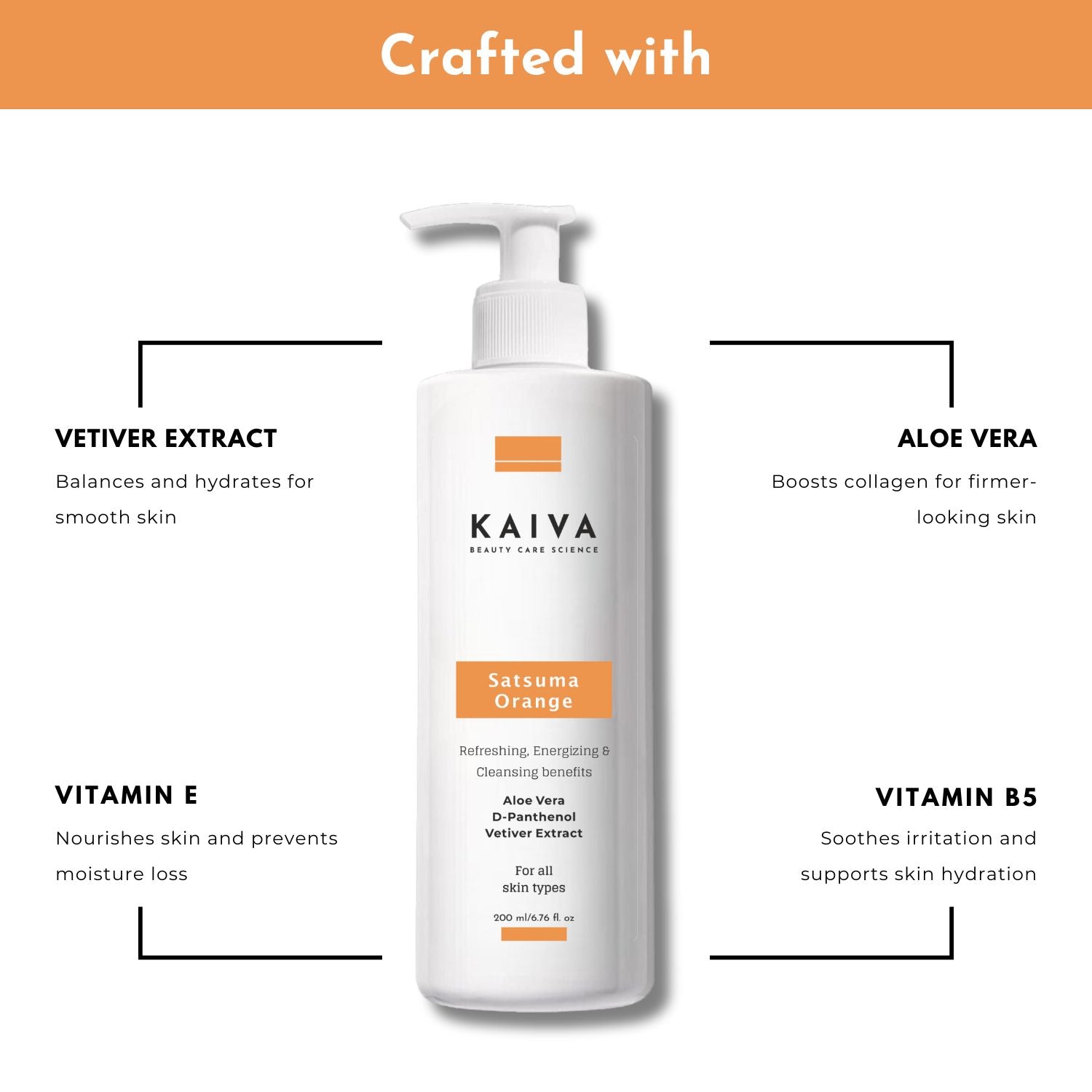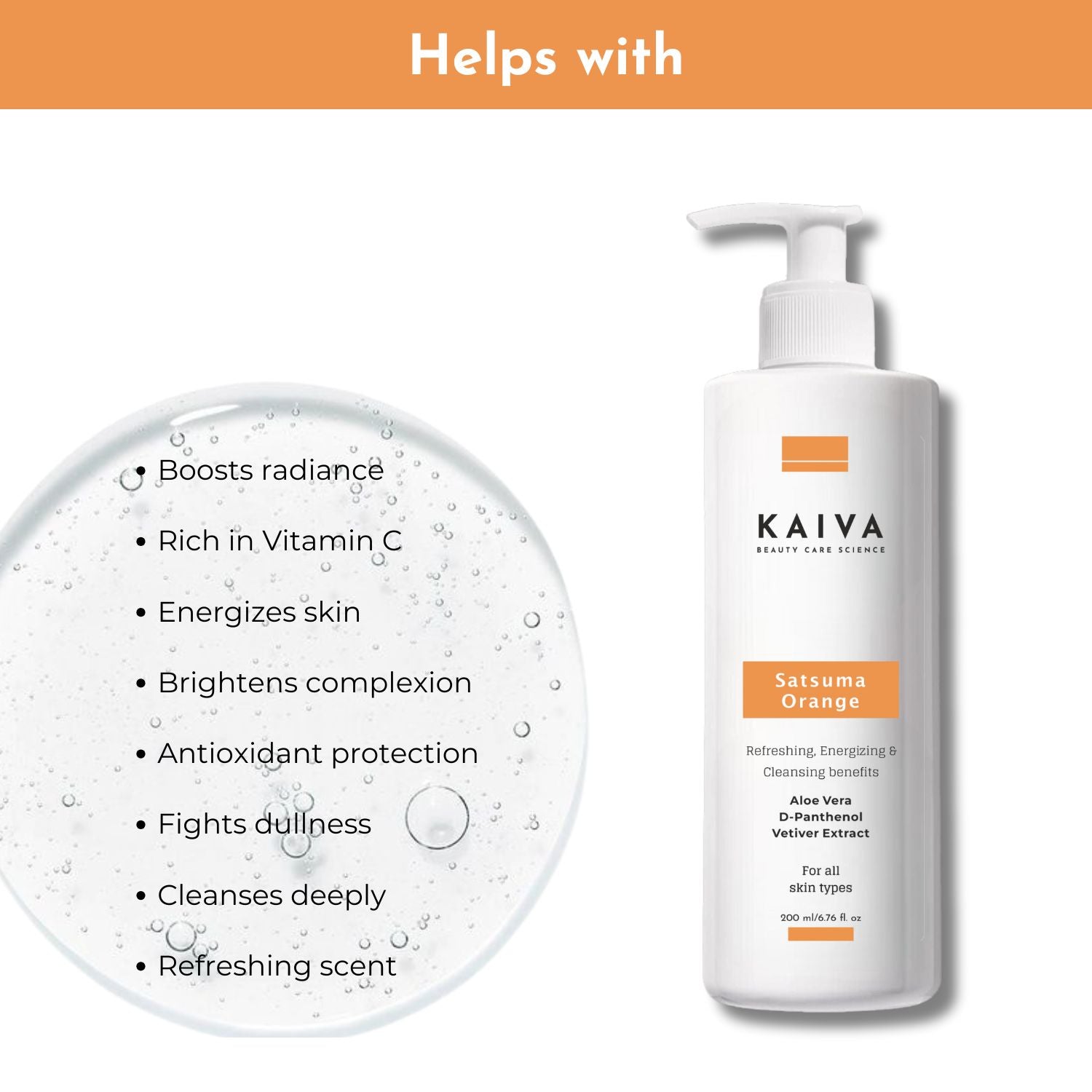 KAIVA's Satsuma Orange Face Wash is a facial cleanser that contains Satsuma Orange extracts, which are rich in Vitamin C and antioxidants. This face wash can help to gently cleanse the skin while providing a range of benefits. The Satsuma Orange extracts in this face wash can help to brighten and even out skin tone, promote collagen production, and protect the skin against environmental stressors. Additionally, the refreshing citrus fragrance of this face wash can provide an invigorating and uplifting experience.