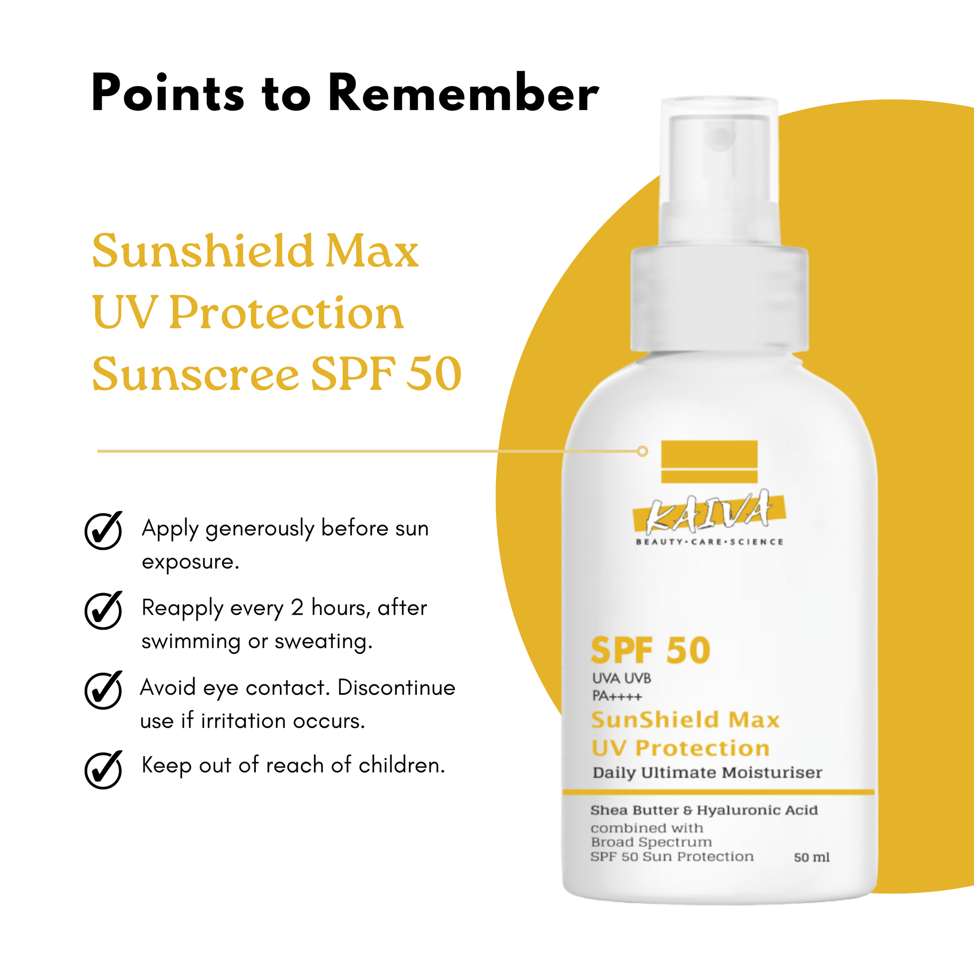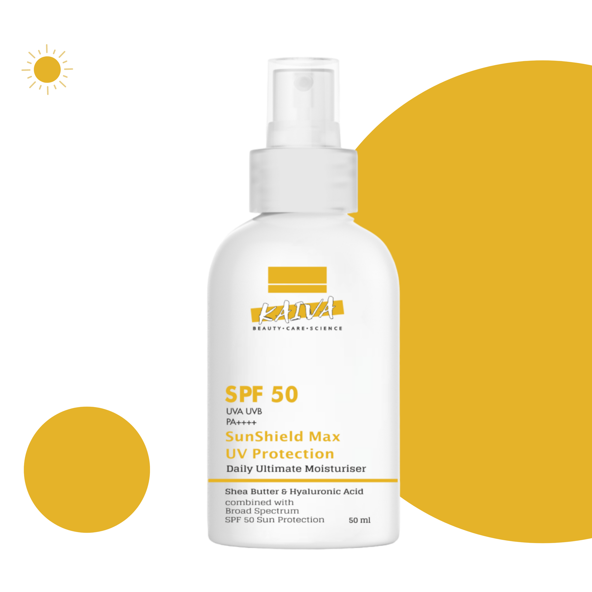 Experience the ultimate sun protection with our cutting-edge SunShield Max SPF50 Sunscreen. This sunscreen offers superior defense against both UVA and UVB rays. Our advanced formula provides a high level of sun protection while keeping your skin nourished and hydrated. The non-greasy texture ensures a lightweight feel and quick absorption, leaving no residue behind. Suitable for all skin types, our SPF50 sunscreen is your go-to companion for daily outdoor activities, beach trips, and prolonged sun exposure. Keep your skin shielded and radiant with SunShield Max SPF50 Sunscreen by Kaiva. Trust in the power of protection.