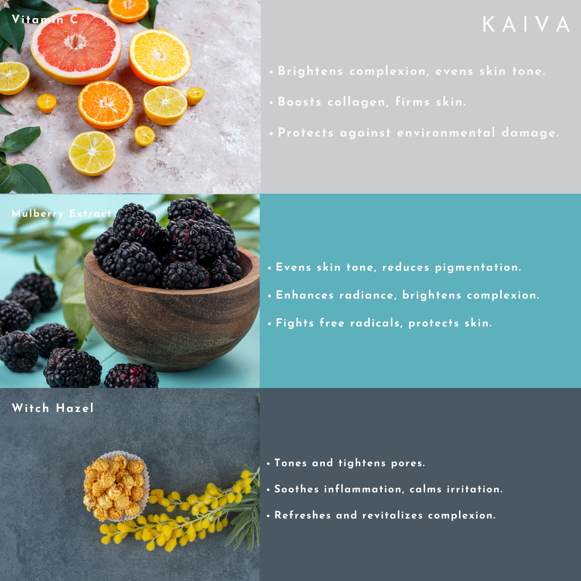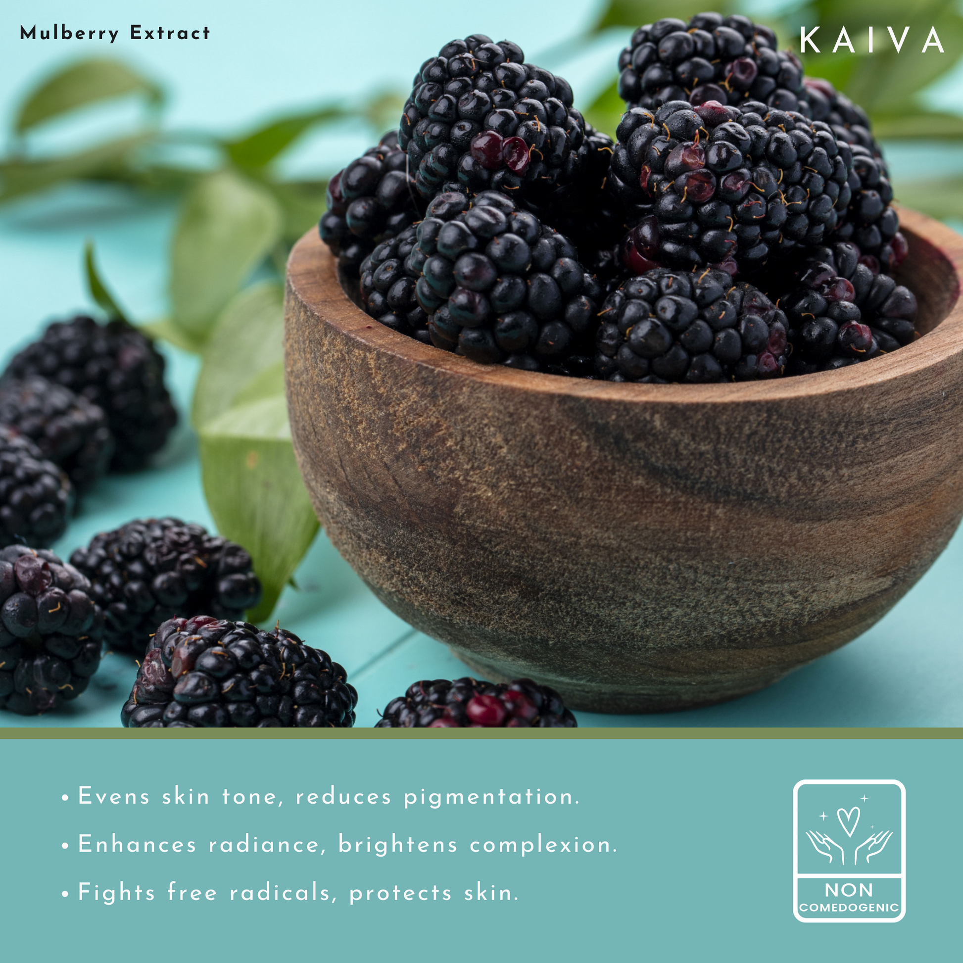 - Vitamin C promotes a luminous complexion, while Mulberry Extract contributes to even skin tone.